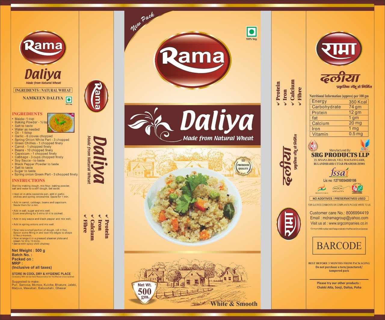 RAMA DALIYA, rich in fibre, provides you and your family with all the essential nutrients so important in your diet. It could feed your healthy breakfast and snack time needs. Otherwise, whenever you get an upset stomach, this Daliya works fine to bring your metabolism back to the front pitch. DALIYA can be taken as a sweetened preparation with milk, garnished with dry fruits. As a salty snack, bake it and then cook it with Moong Dal in water. Enjoy DALIYA as a soup or make a healthy meal, cooking it with vegetables. Rich in proteins, it makes an ideal wholesome breakfast and being low in calories makes it a light evening snack.